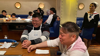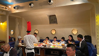 船室のような佇まいにウェイトレスさんは海兵のセーラー服という、ちょっと変わったお店にみんなビックリ!