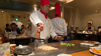 目の前の鉄板で焼かれる海鮮やパフォーマンスに皆で大いに盛り上がりました。