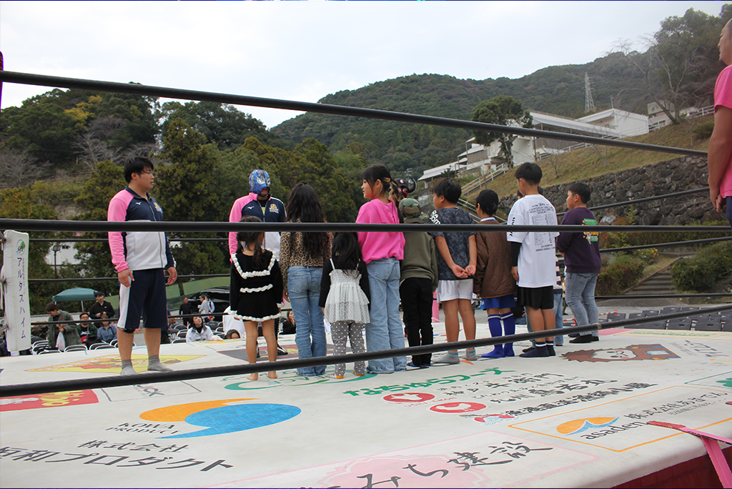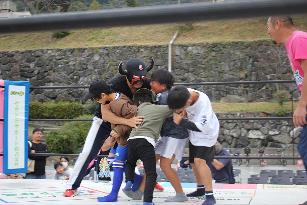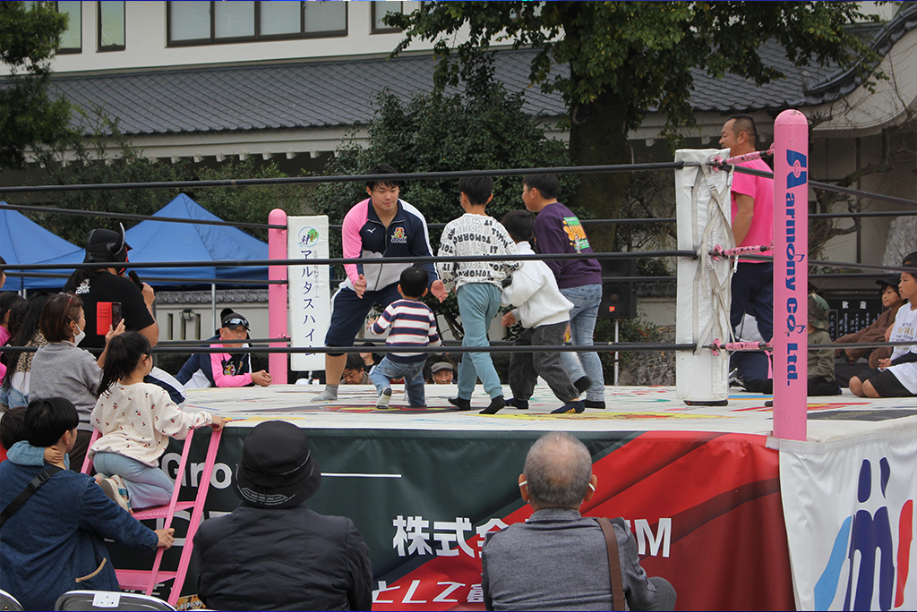 全日本グループ四国エリアが主催し、プロレスの試合に加えてよさこい演舞や自衛隊車両展示など地域文化と連携した多彩なコンテンツを用意したことで、子どもからお年寄りまで幅広い年齢層が楽しめる地域密着型イベントとして成功を収め、「人生は祭りだ!」のテーマどおり、笑いと熱狂に満ちた一日となりました。